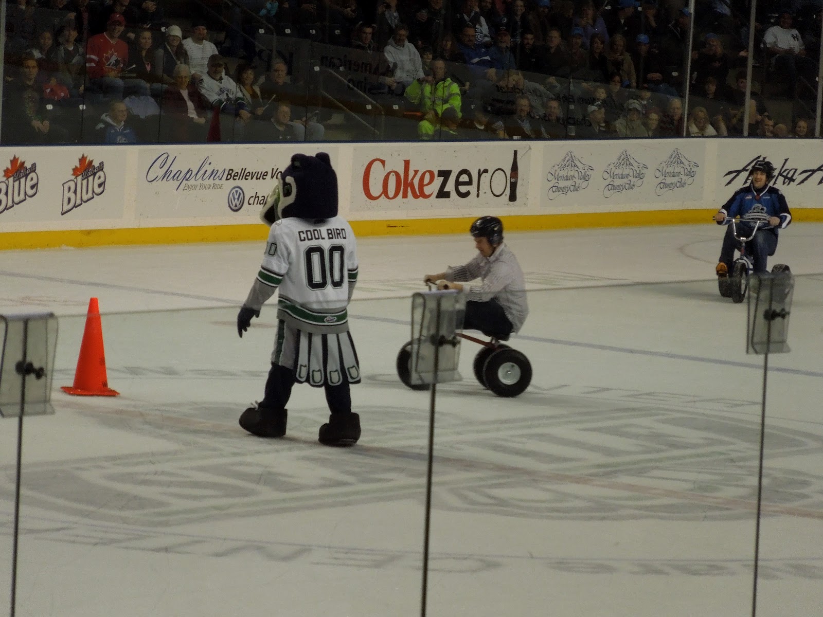 We walk into this minor league hockey game in Kent and 8 seconds after we get in, a guy comes up and asks if we want to be part of the intermission entertainment. After considering the safety and legal ramifications of such a crazy endeavor, we ask what we're going to do. He says "Ride tricycles." We